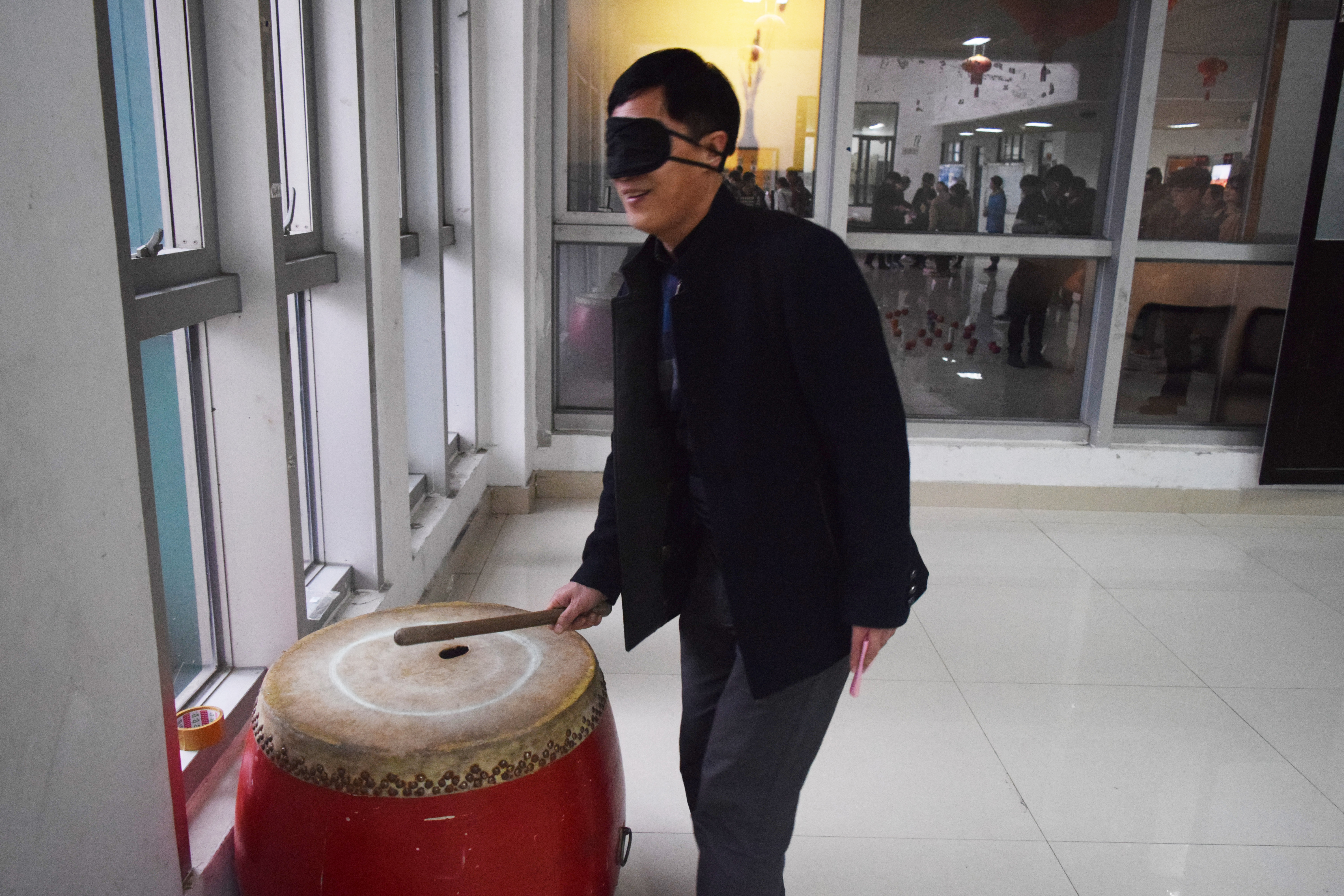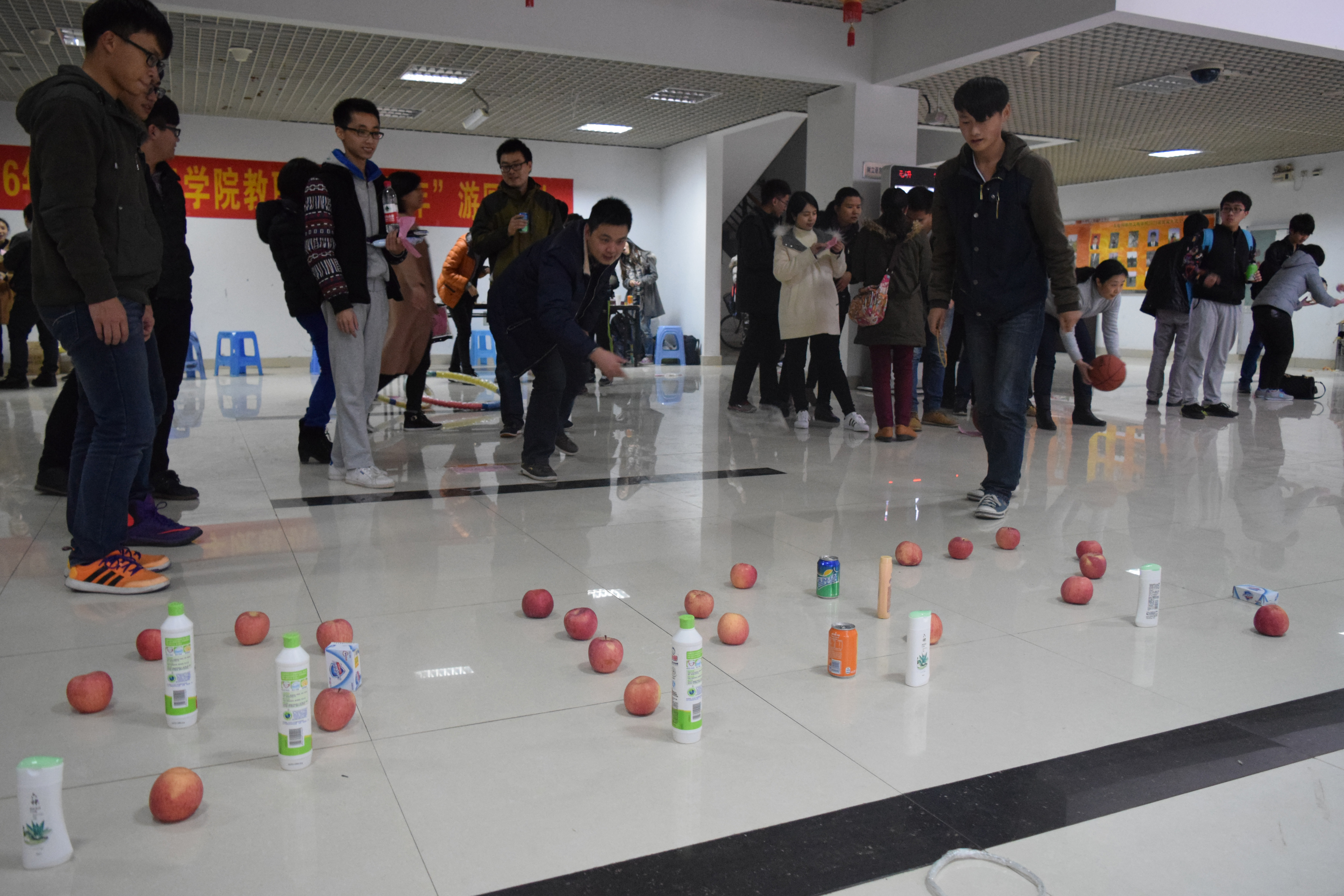 接下来便是一连串的闯关游戏:“踢毽子”、“蒙眼击鼓”、“超级保龄球”等,由学生当裁判,不仅能让老师们在欢乐的气氛中忘却疲惫,更是增进了师生间的感情。在老师们通关之后,院工会也准备了丰厚的礼品等着大家领取。