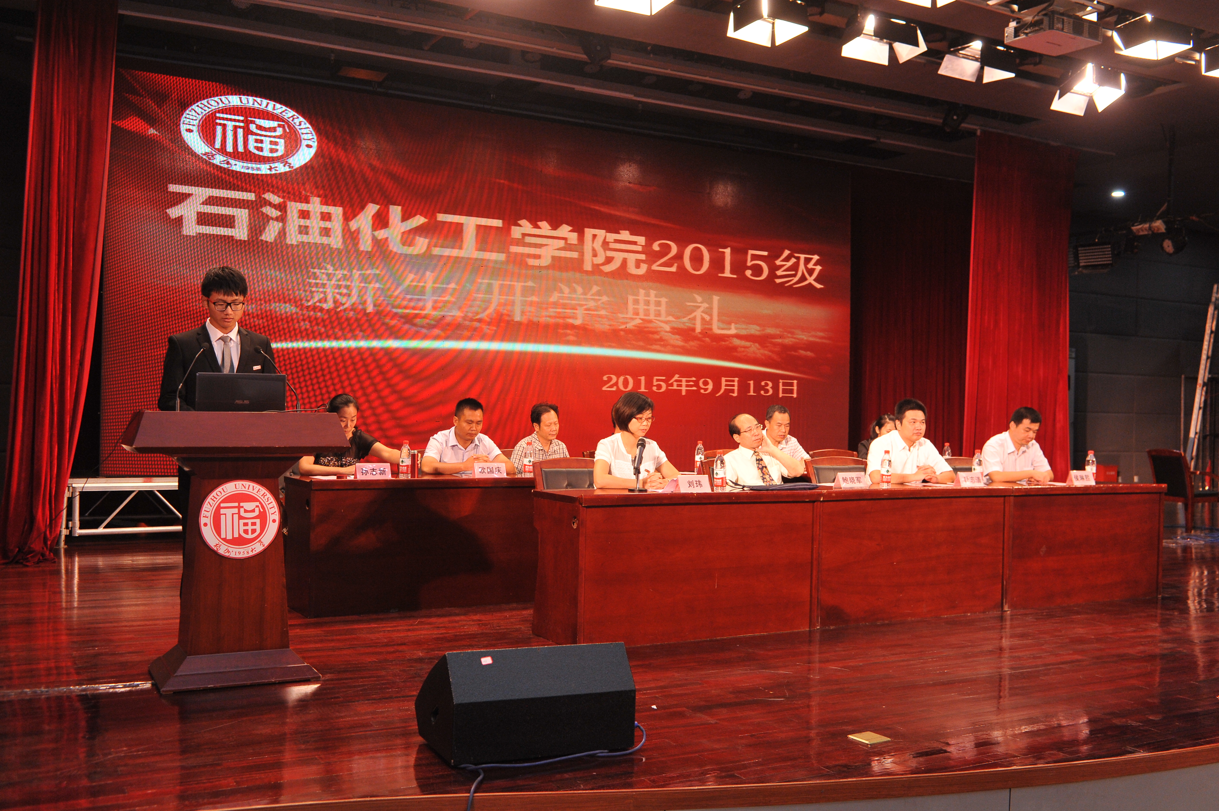 首先,学院孙志新老师代表全院所有老师欢迎2015级新生加入我们的石化大家庭。孙老师用轻松、诙谐的语言和我们分享了大学最后悔的5件事,希望新生好好利用学校的学习资源,参加一些活动,提升学习之外的能力,趁年轻,及早规划自己的人生。紧接着是2013级本科生代表蔡世逸和2015级新生代表郑萱同学先后上台发言。他们分别分享了在校生活的感受,和对美好的大学新生活的憧憬。