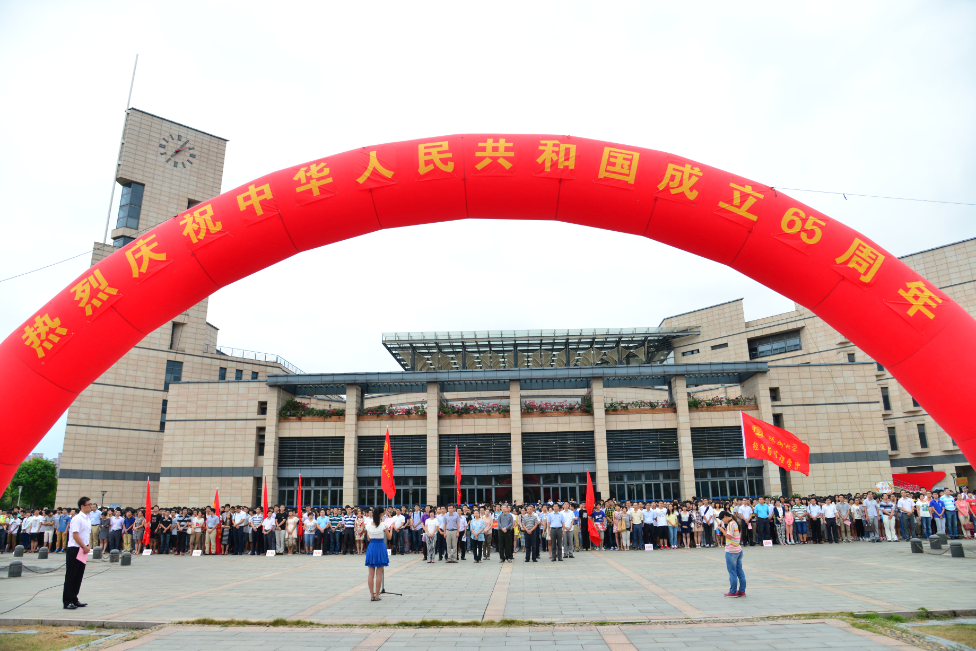 在旗山校区图书馆前万福广场隆重举行国庆升旗仪式。学校党委陈少平副书记、全体政工干部、学生代表等近5000名师生参加。 苏畅