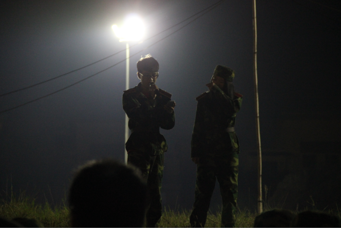 的新生在本次军训中分为五个排,以深蓝的夜空为顶,碧绿的草地为底,路灯作为了聚光灯,组成了天然的舞台。各排纷纷献上精彩节目并现场组织了游戏环节。分别由同学们与班导演唱了《夜太美》等歌曲,歌声悠扬动听,现场气氛活跃,同学们甚至“以草为花”,为表演者们献礼。由同学组织的“青蛙游戏”,在教官与同学们的互动中,欢笑声阵阵,现场气氛达到高潮。伴着大家热烈的掌声与洪亮的“教官辛苦了”,才艺晚会就此告一段落。