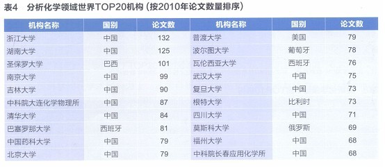 分析化学学科在分析化学领域世界TOP20机构按2010年论文数量排序位居世界第19位(见以下图表)。这一国家层面上的评估结果充分显示 苏畅