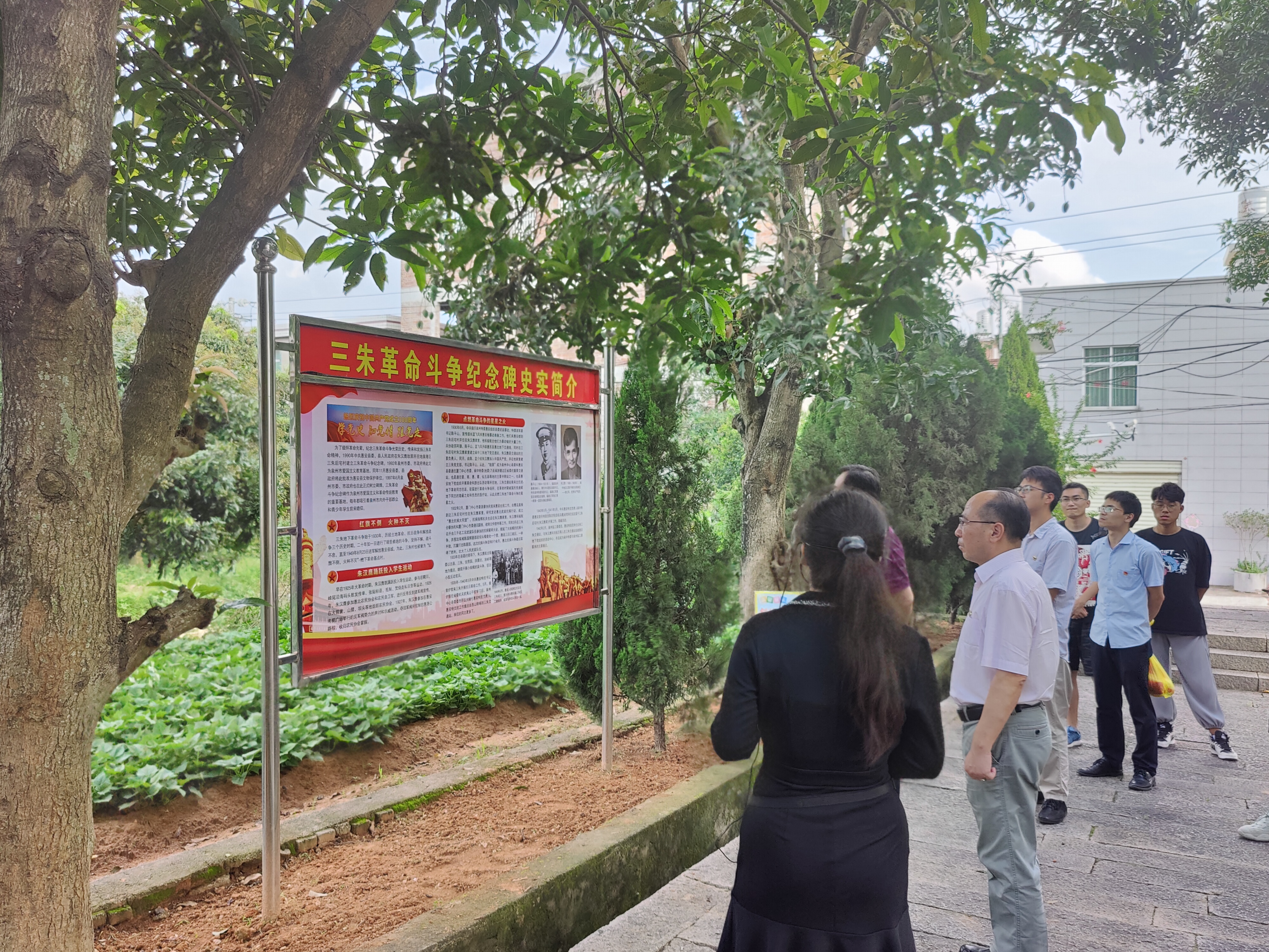 参与活动的党员首先来到三朱革命纪念碑。三朱革命纪念碑耸立在山坡的最高点,依山而建,坐北朝南。纪念碑前,党员们聆听着讲解员讲述的三朱革命的历史故事,随后,全体同志依次瞻仰纪念碑,感受那段艰苦卓绝的革命岁月。