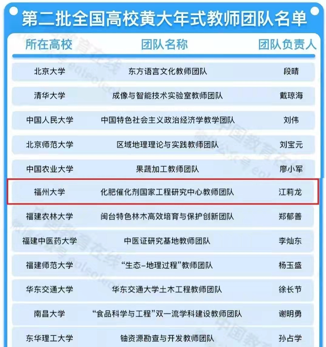 化肥催化教师团队历经卢嘉锡院士、魏可镁院士和江莉龙研究员三代人四十多年的传承与发展,汇聚了一批包含国家杰青、国家科技创新领军人才、973首席科学家、国家优青、青年长江、闽江学者在内的高层次人才,平均年龄40岁,是一支既能在工程应用领域开展关键技术创新研究,又能在教育教学中立德树人、示范引领的优秀团队。团队面向粮食安全、节能环保和能源安全领域的国家重大战略需求开展教学科研工作,与企业合作生产消毒防疫物资,助力新冠抗疫胜利,坚持论文写在祖国大地上,以科学精准施肥助力脱贫攻坚取得胜利。其中“铁钌接力催化氨合成成套技术”打破了国外长期技术垄断,攻克了合成氨高温高压的工程技术难题,对我国合成氨工业的节能、减排和增效具有重要意义。有力地推动了我国化工学科的发展与技术进步,并为 苏畅