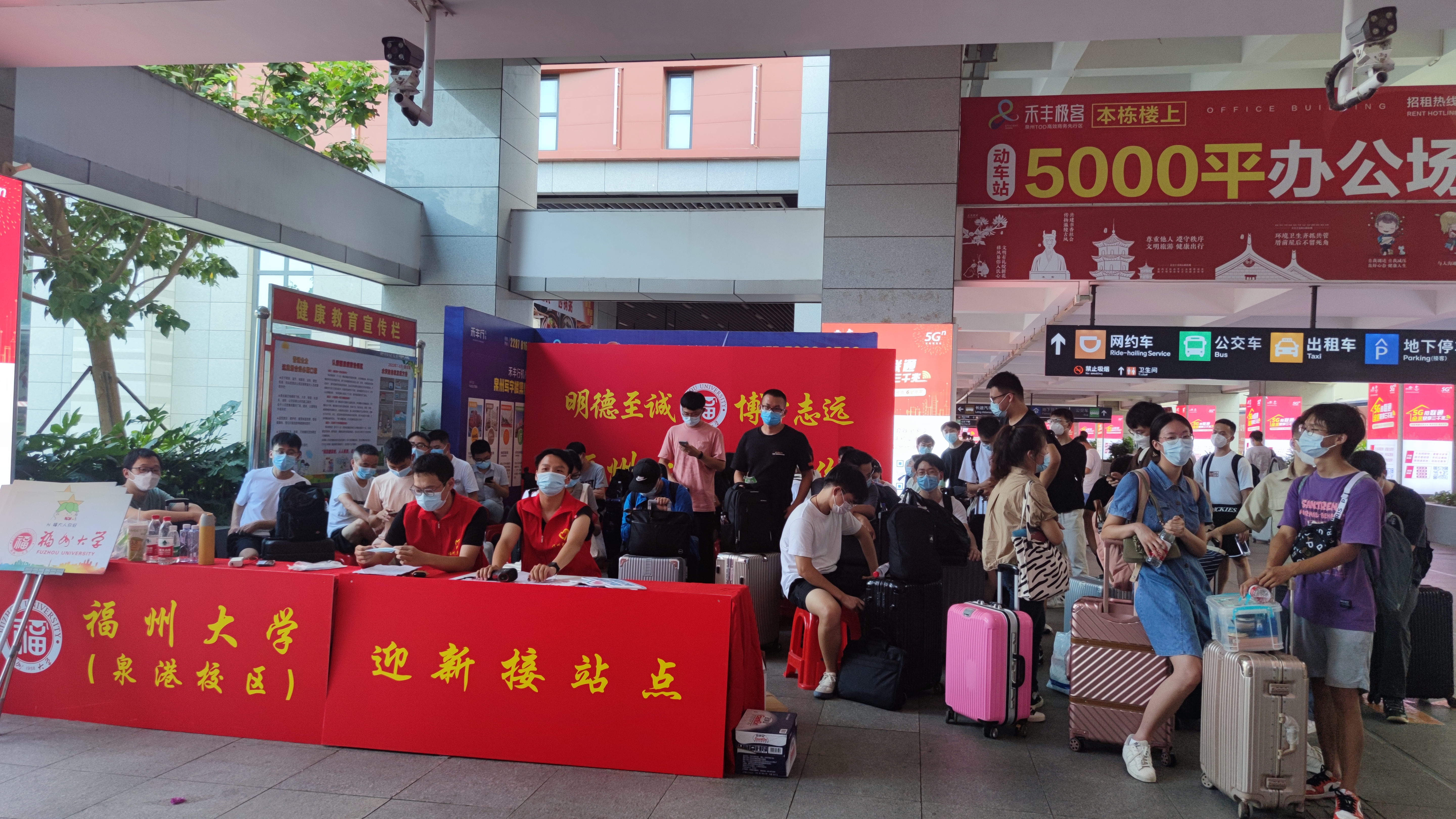 上午8点半,学生志愿者们前往泉州动车站迎接新生。在完成落地核酸检测后,校区安排专车将陆续到站的同学分批送到学校。
