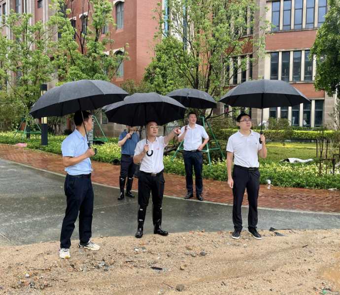 台风来临前,党员突击队多次深入校区食堂、宿舍、教室、办公室开展全方位检查,扎实打好防风抗汛有备之战。针对校区内施工点较多,王文栋副院长、陈展飞副院长和泉州市教育局林长华副局长一起察看建筑工地,与工程单位负责人制定紧急预案,对护坡开挖引水沟并用沙袋加固防水墙。
