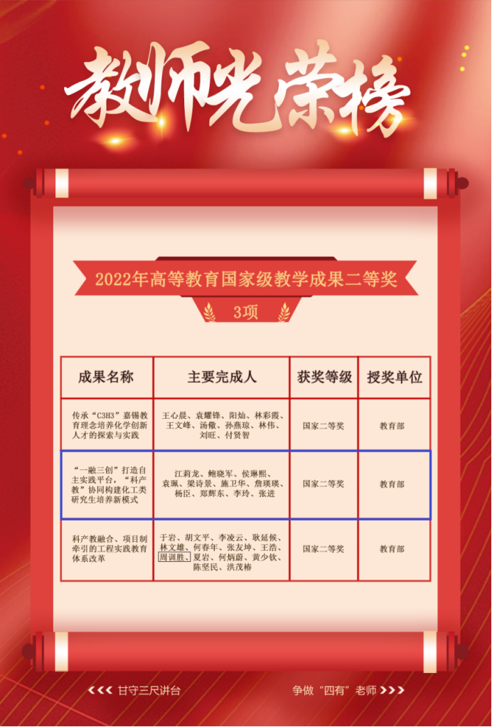 国家级教学成果奖是高等教育教学改革领域的最高荣誉,每4年评选一次,是与国家自然科学奖.国家技术发明奖、国家科技进步奖并列的国家级奖项。