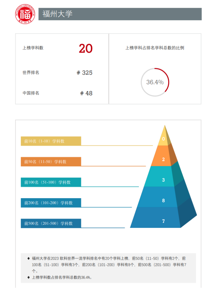 共有20个学科上榜,前50名(11-50)学科有2个,前 100名(51-100)学科有3个,前200名(101-200)学科有8个,前500名(201-500)学科有7 个。上榜学科数量世界排名前进89名,位居世界第325位,内地高校排名前进5名,位居第48位,连续6年实现增长,学科总体排名较往年有较大提升。
