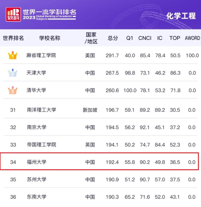 化学工程学科全球高校排名(节选)