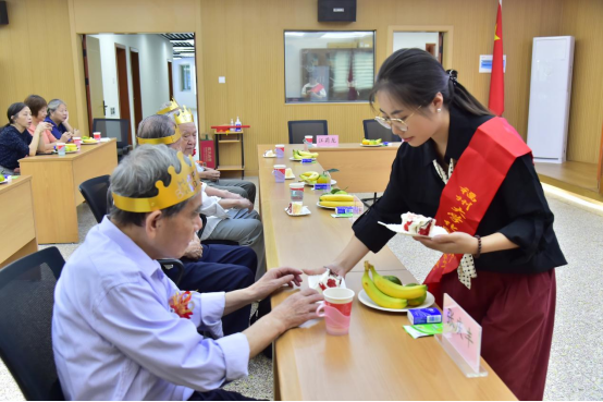 随后,与会领导为今年满90、85、80、75、70周岁的寿星祝寿。党员志愿者们推出祝寿蛋糕,伴随着欢快的生日歌,志愿者将蛋糕分发给老教师们,全场教职工共同分享此刻的喜悦与温馨。祝愿寿星们福如东海,寿比南山,祝愿学院离退休的老教师们身体健康、福寿延年。