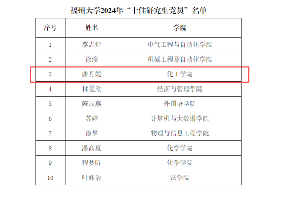2023级化学工艺专业硕士研究生唐丹妮同志凭借出色的表现,脱颖而出,获评“十佳研究生党员”荣誉称号。