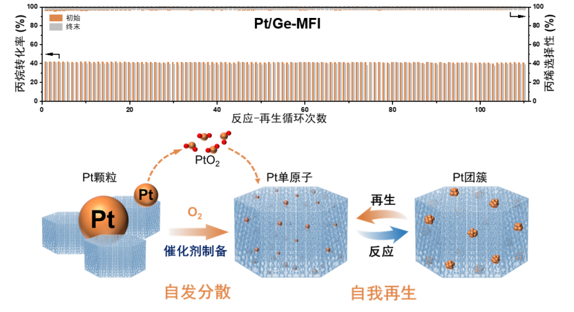 页岩气革命和“双碳”战略推动了丙烷脱氢(PDH)技术的迅猛发展,使其成为定向生产丙烯的主流路线。负载型Pt团簇是PDH技术的主流催化剂。然而,Pt团簇在苛刻服役工况下极易发生烧结失活,为此工业上必须频繁地在氧-氯混合气氛中通过氯诱导Pt颗粒再分散,同时烧除积炭,以恢复其催化活性。这不仅导致设备腐蚀和含氯污染物生成,还会产生大量的碳排放。因此,创制无氯条件下可再生的Pt基催化剂,一直是催化科学与技术领域关注的重大课题。