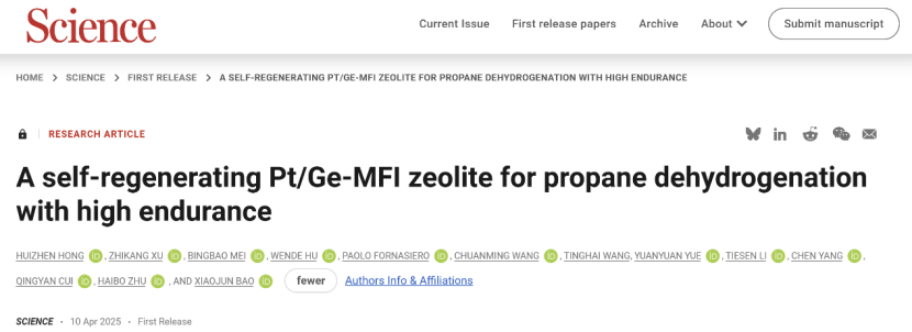 、氟氮化工新材料全国重点实验室鲍晓军教授、朱海波教授团队联合清源创新实验室、中石化(上海)石油化工研究院有限公司、上海高等研究院(上海光源)等单位在“丙烷脱氢催化剂”研究方面取得重大进展,于2025年4月11日以“FirstRelease”形式在世界顶级学术期刊Science上发表了题为“A self-regenerating Pt/Ge-MFI zeolite for propane dehydrogenation with high endurance”的研究论文(doi:10.1126/science.adu6907)。 苏畅