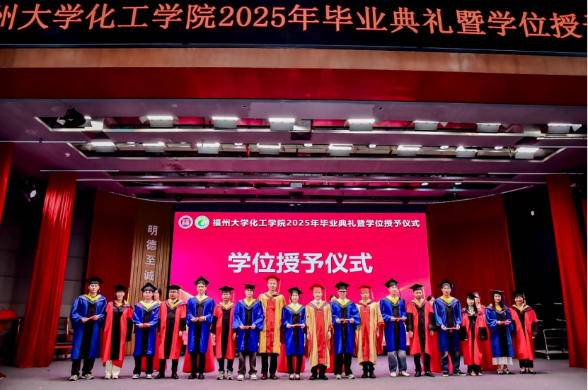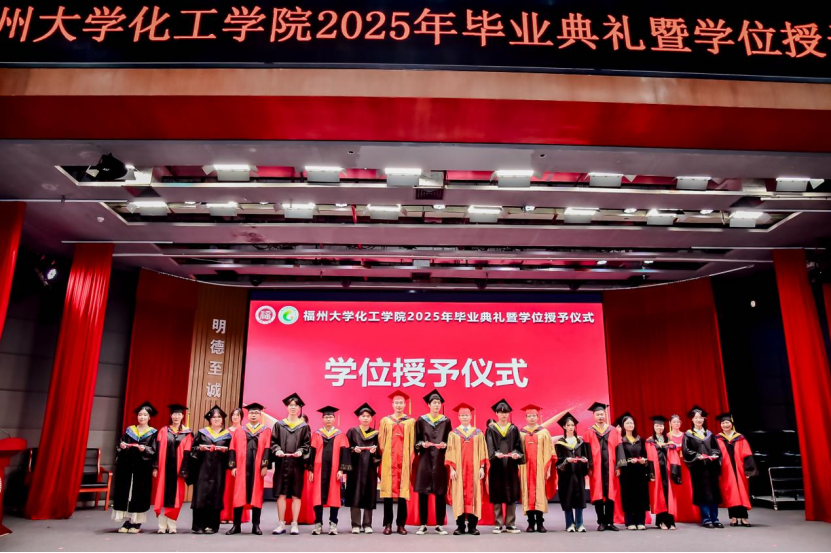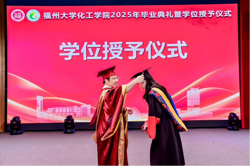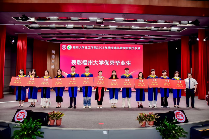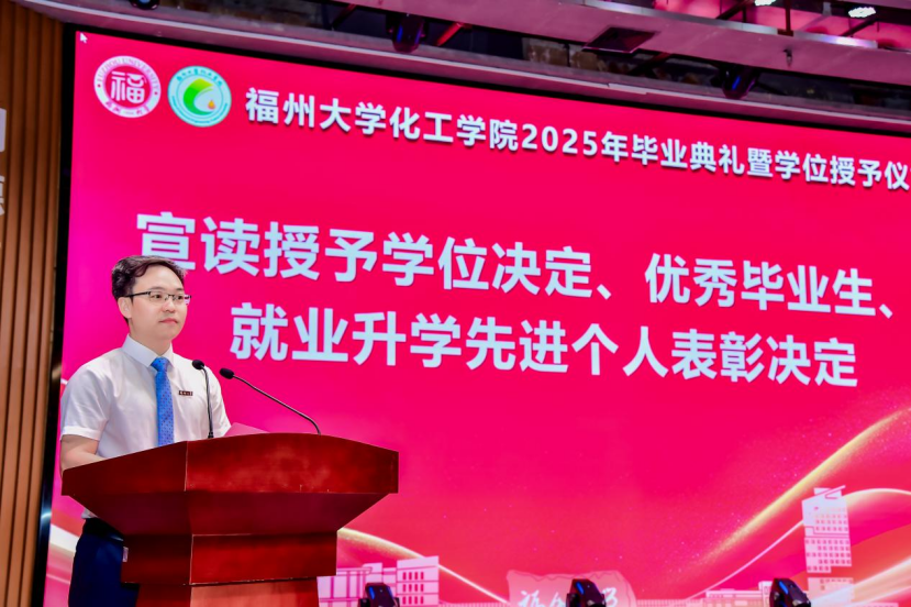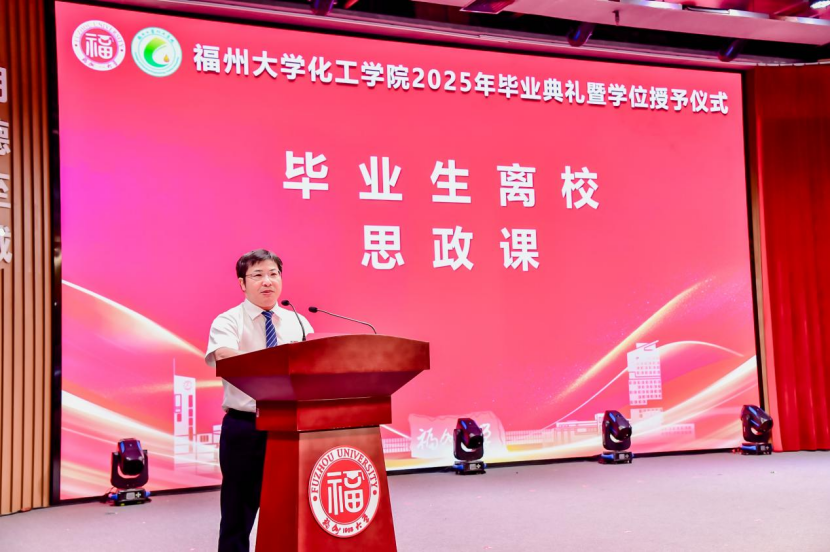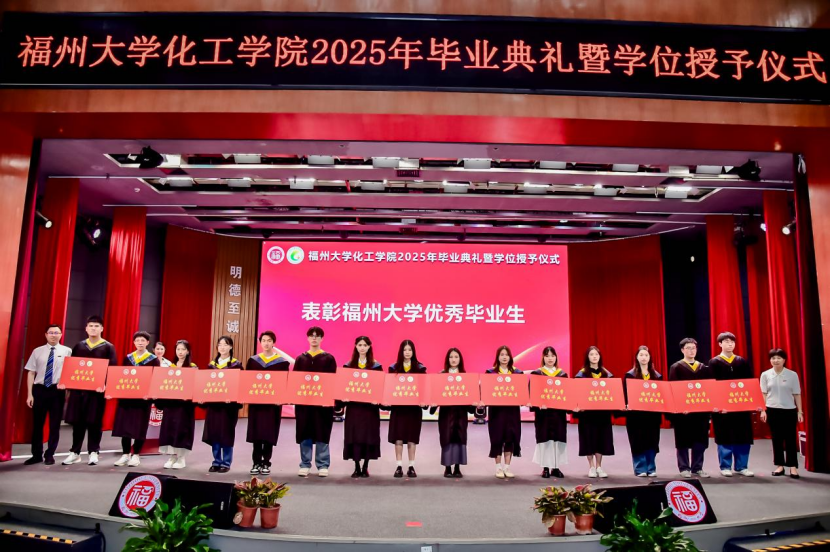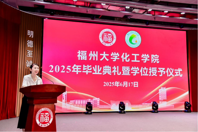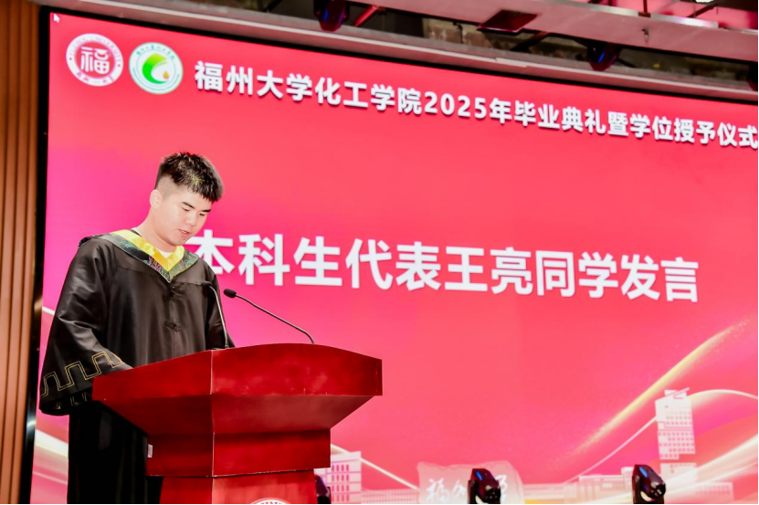研究生代表陈敏丹深情回忆了在化工的成长旅程,号召同学们无论投身科研攻坚还是基层奉献,都要带着“三种精神”的传承,践行福大化工人的使命担当。本科生代表王亮在发言中分享了四年的成长故事,感恩母校培养与师长教导,即将赴华中科技大学深造的他表示,将深耕能源化工领域,未来反哺母校。