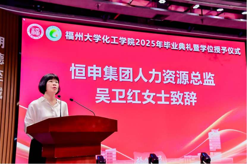 福建恒申集团人力资源总监吴卫红女士作为企业代表致辞,向毕业生致以热烈祝贺。她强调了化工行业对国家发展的重要性,号召学子传承魏可镁院士勇于拼搏的奉献精神,并分享了职场建议:保持好奇心、提升沟通能力、坚守行业初心。同时,她表示恒申集团与福大共建的创新研究院将持续推动产学研融合,助力人才培养。