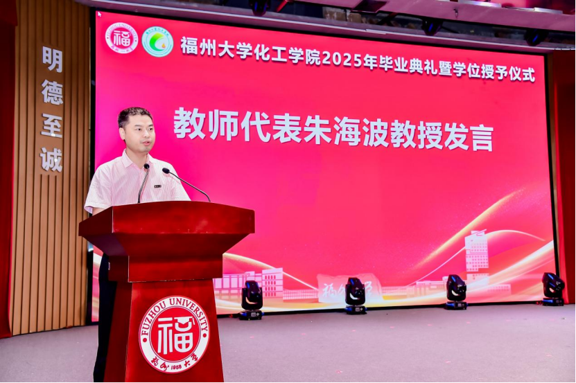 教师代表朱海波教授深情寄语毕业生,高度赞扬同学们在科研攻关中的卓越表现,特别肯定了研究生团队在《Science》《Nature》发表突破性成果的科研贡献。勉励学子在新征程中践行福大精神,以创新担当服务国家发展,并为毕业生送上最真挚的祝福,期待他们在更广阔的舞台上续写辉煌。