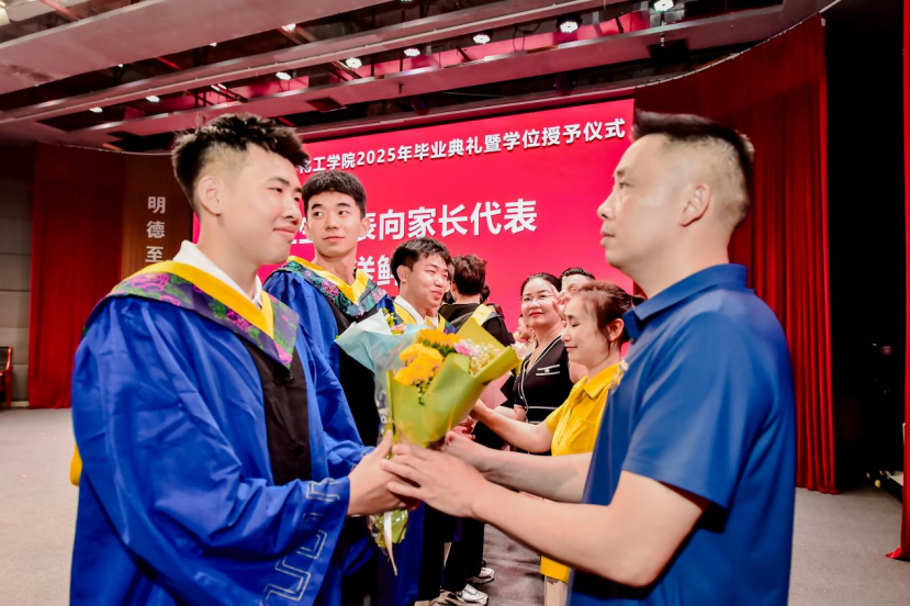 春晖寸草心,山高海深恩。毕业生代表们手捧鲜花走向默默守护自己的父母,一声感谢、三次鞠躬、深情拥抱,凝聚着学子们对父母最诚挚的谢意。