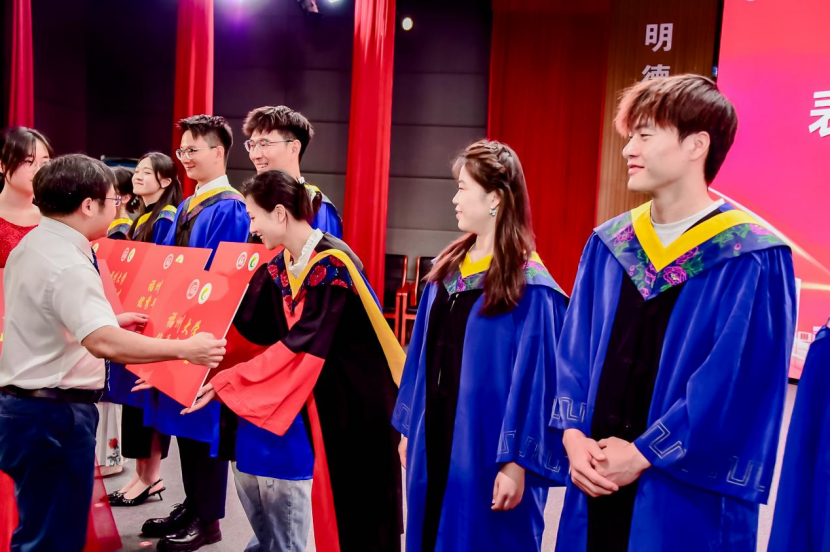 典礼的“高光时刻”属于学位授予环节。江莉龙副校长和学院学位评定分委员会委员为毕业生逐一拨正流苏、授予学位证书,并握手祝福。当流苏从右向左,毕业生们正式从“学生”蜕变为“校友”。