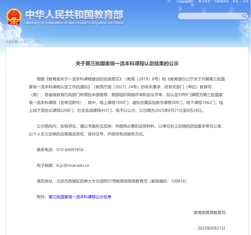 在此次认定中表现突出,共有2门课程成功入选第三批国家级一流本科课程认定公示名单。