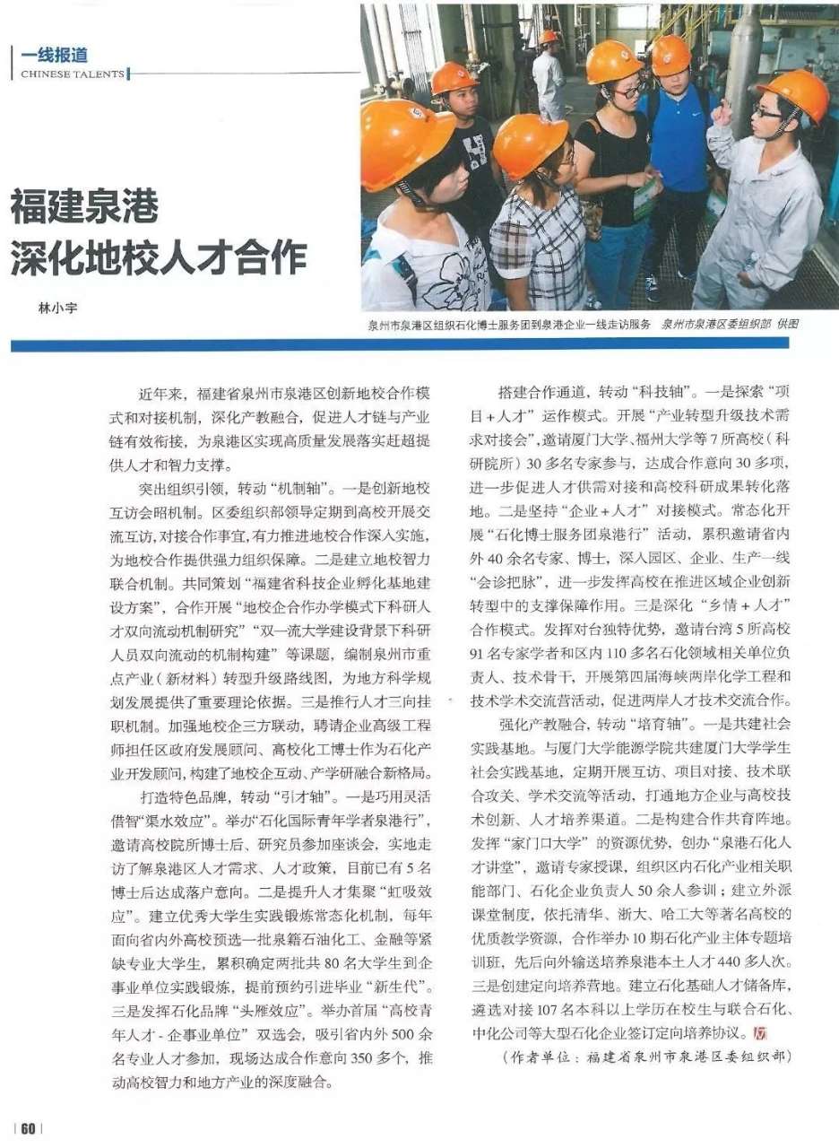 搭建青年人才引进培养新平台,建立优秀大学生实践锻炼常态化机制,每年面向省内外高校预选一批泉籍石油化工、金融等紧缺专业大学生,累积确定两批共80名大学生到企事业单位实践锻炼,提前预约引进毕业“新生代”。
