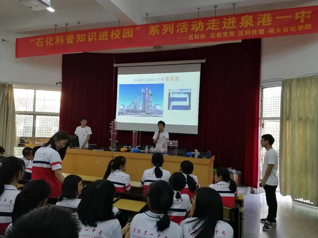 等单位联合举办的“石化科普知识进校园”系列活动先后走进泉州泉港一中、天竺中学、泉州北大培文实验学校、泉港六中。