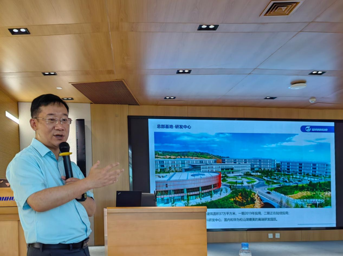 822日上午,实践队一行抵达万华化学公司,受到企业相关人员的热烈欢迎。在公司会客厅,万华化学招聘经理白朔先生为实践队讲述了企业发展历程、公司概况、建设理念及行业发展方向。他表示,万华化学能够历经45年来从小型合成革厂,逐渐迈向国际一流化工新材料有限公司离不开自主创新,唯有坚持走创新道路才能让中国化工真正屹立于世界舞台之上。