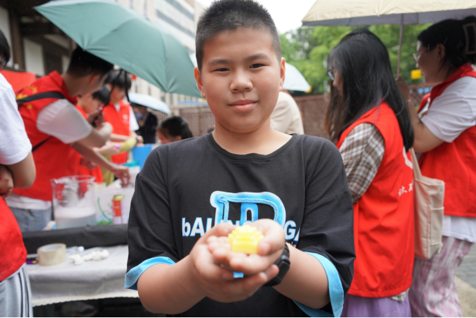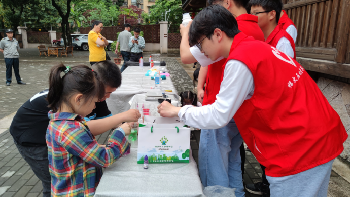 参观结束后,同学们在故居前的广场上搭建实验场地、为陆续前来参观的中小学生以及市民们带来一场有趣的化工科普活动。通过掌中火焰水蒸气蘑菇云、手工香皂、海洋瓶等有趣的化工小实验,向人们宣传绿色化工理念,把中华传统文化中崇尚科学、勇于创新的精神同绿色化工科普活动有机结合,激发青少年爱科学、学科学、用科学,学化工、懂化工、爱化工的兴趣,在中小学生的心灵中种下一颗探索科学的种子