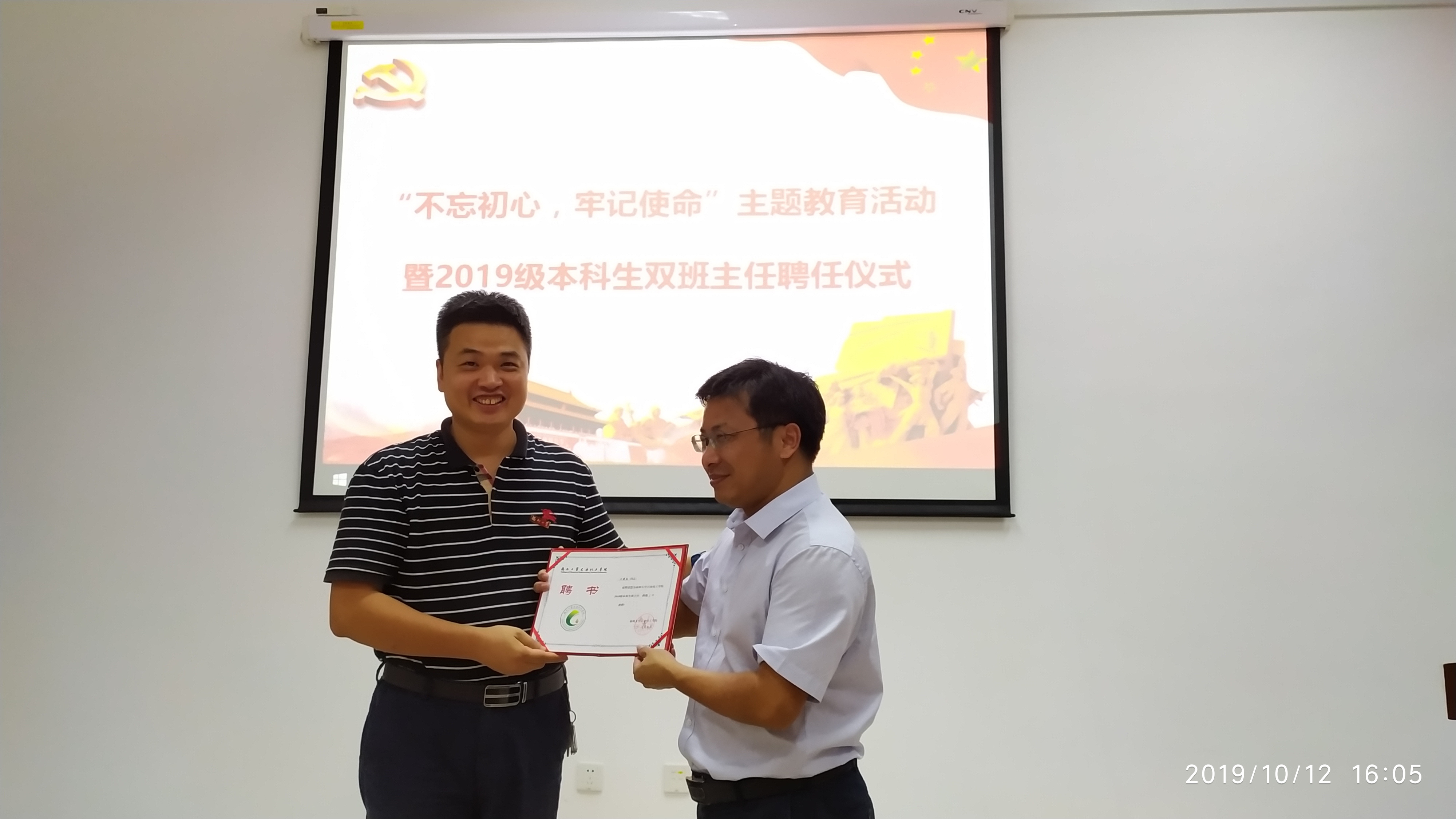 关于聘任2019级本科生双班主任的通知》,通过学院前期动员与申报,共计聘任16位教师担任2019级本科生班主任,其中包括学院党委书记、院长、常务副院长、副院长等党政班子成员及国家杰出青年基金获得者、国家科技创新领军人才、国家级教学名师、全球高被引科学家、闽江学者等省级以上人才,形成由学院党政班子和省级以上人才为代表的专业教师组成的具有学院特色的双班主任制。现场进行了班主任聘书颁发仪式。